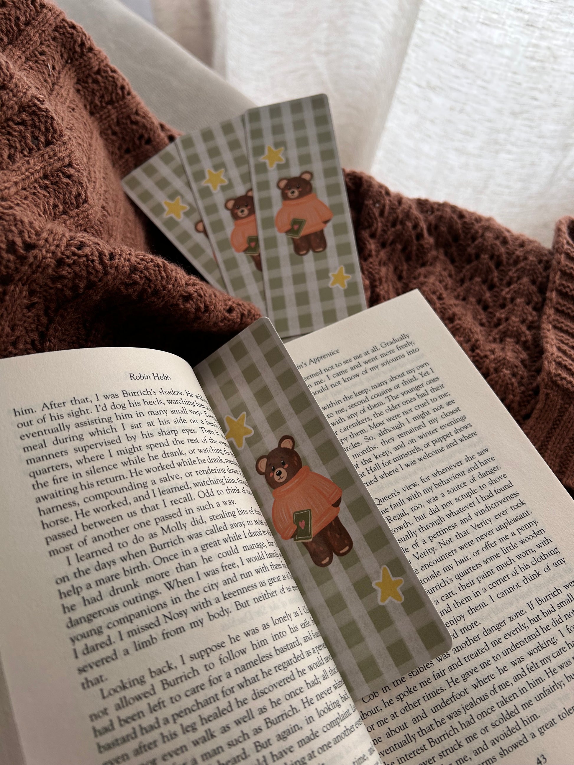 Slow down, get comfy, and turn the page with this cosy double-sided bear bookmark. Featuring a sweet little bear in a knitted sweater, happily lost in a book, this design is set against a soft green gingham 🧸📖